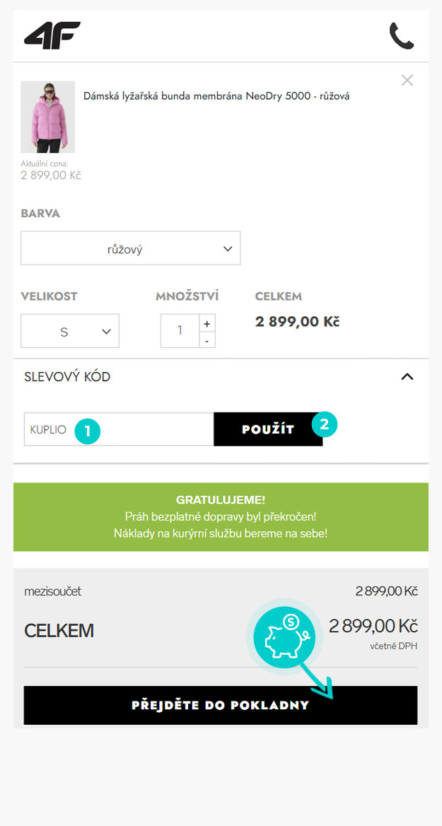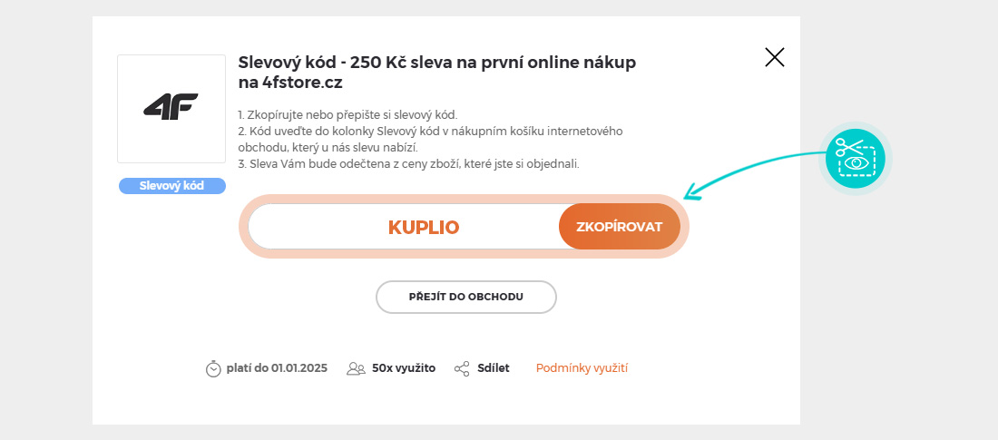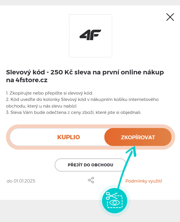 Zkopírujte nebo si opište slevový kód a klikněte na tlačítko "Přejít do obchodu". Následně budete přesměrováni přímo do e-shopu 4fstore.cz.