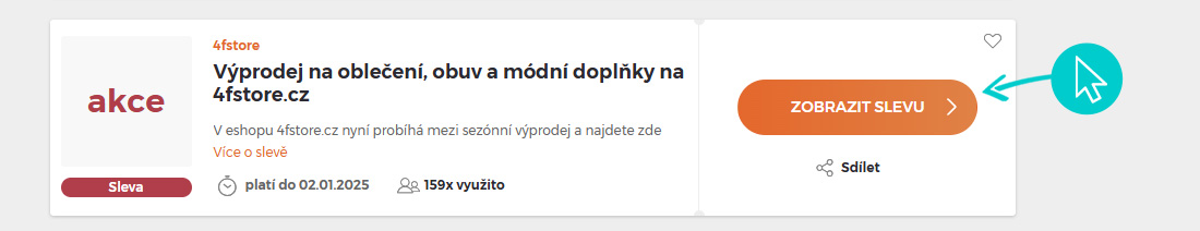 Vyberte si na naší stránce konkrétní 4fstore slevu a klikněte na tlačítko "Získej slevu". Automaticky budete přesměrováni přímo na akční nabídku v internetovém obchodě 4fstore.cz, kde můžete produkt nakoupit se slevou.