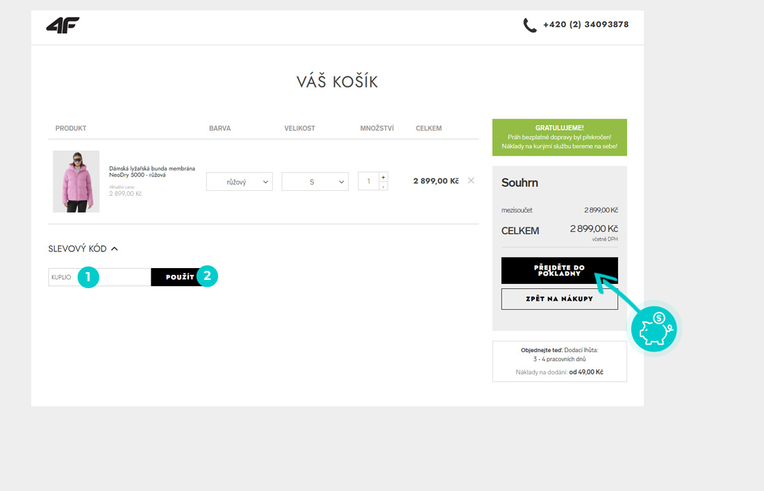 Vyberte si produkt v e-shopu 4fstore.cz, o který máte zájem, stiskněte tlačítko "Přidat do košíku" a produkt se automaticky vloží do nákupního košíku. Přímo v nákupním košíku najdete pod vámi vybraným produktem políčko "Slevový kód". Zde vložte zkopírovaný slevový kód nebo jej ručně vepište a potvrďte tlačítkem "Vložit".
