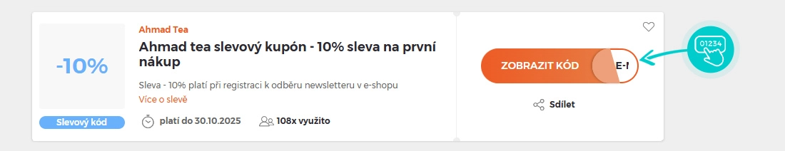 Vyberte si konkrétní slevový kód na naší stránce, který si chcete uplatnit v e-shopu Ahmadtea.cz. Klikněte na oranžové tlačítko "Zobrazit kód".