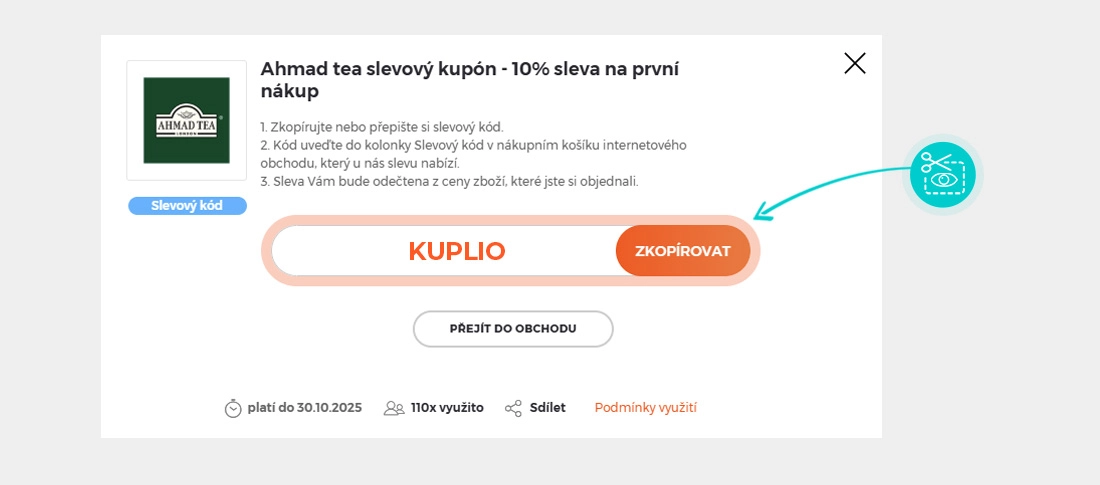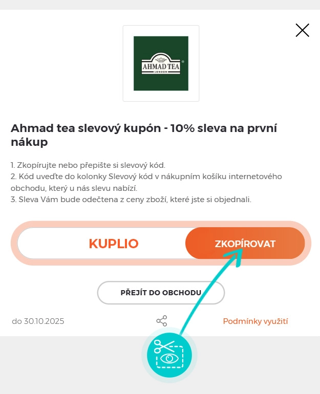 Zkopírujte nebo si opište slevový kód a klikněte na tlačítko "Přejít do obchodu". Následně budete přesměrováni přímo do e-shopu Ahmadtea.cz.