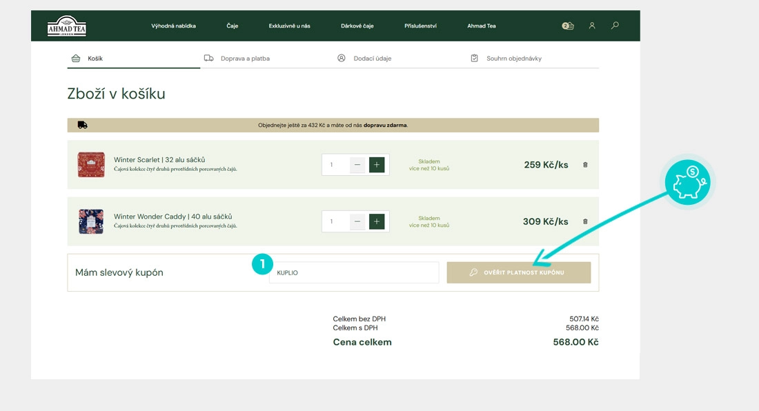 Vyberte si produkt v e-shopu Ahmadtea.cz, o který máte zájem, stiskněte tlačítko "Přidat do košíku" a produkt se automaticky vloží do nákupního košíku. Přímo v nákupním košíku najdete pod vámi vybraným produktem vedle políčka "Mám slevový kupón". Zde vložte zkopírovaný slevový kód nebo jej ručně vepište a potvrďte tlačítkem "Ověřit platnost kupónu".