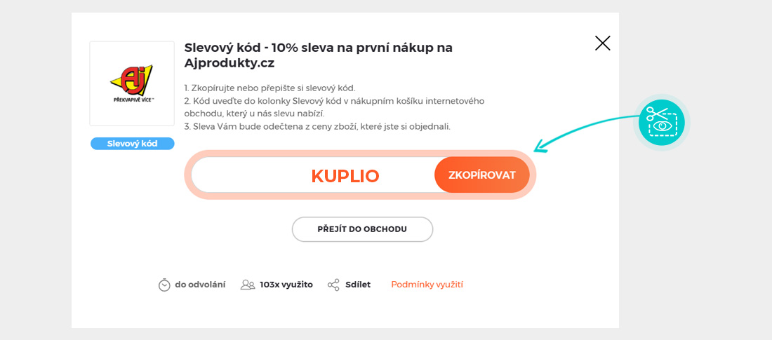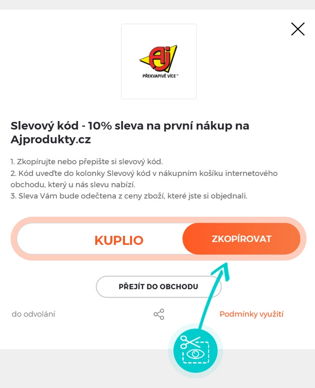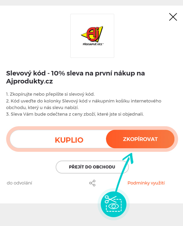 Zkopírujte nebo si opište slevový kód a klikněte na tlačítko "Přejít do obchodu". Následně budete přesměrováni přímo do e-shopu AJprodukty.cz.