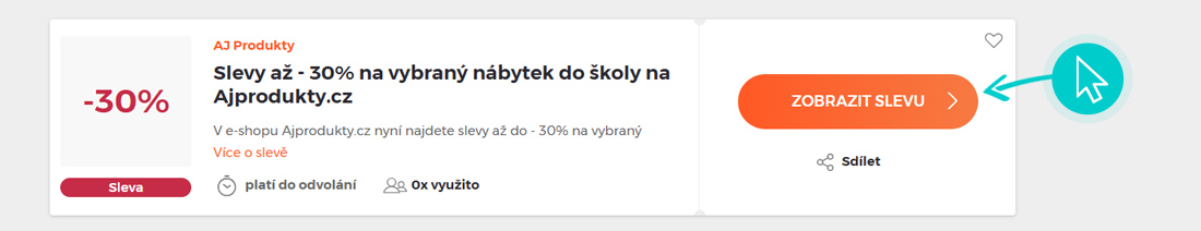 Vyberte si na naší stránce konkrétní AJ produkty slevu a klikněte na tlačítko "Získej slevu". Automaticky budete přesměrováni přímo na akční nabídku v internetovém obchodě AJprodukty.cz, kde můžete produkt nakoupit se slevou.