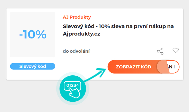 Vyberte si konkrétní slevový kód na naší stránce, který si chcete uplatnit v e-shopu AJprodukty.cz. Klikněte na oranžové tlačítko "Zobrazit kód".