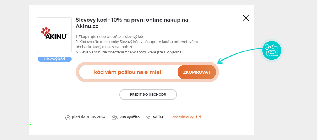 Zkopírujte nebo si opište slevový kód a klikněte na tlačítko "Přejít do obchodu". Následně budete přesměrováni přímo do e-shopu Akinu.cz.