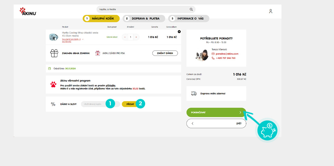 Vyberte si produkt v e-shopu Akinu.cz, o který máte zájem, stiskněte tlačítko "Přidat do košíku" a produkt se automaticky vloží do nákupního košíku. Přímo v nákupním košíku najdete pod vámi vybraným produktem políčko "Vložit slevový kupón". Zde vložte zkopírovaný slevový kód nebo jej ručně vepište a potvrďte tlačítkem "Přidat".