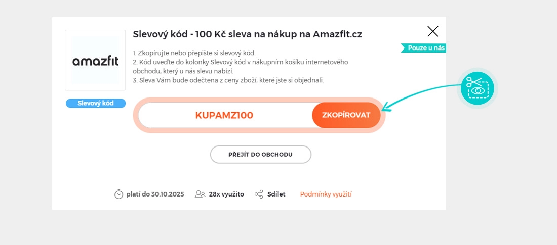 Zkopírujte nebo si opište slevový kód a klikněte na tlačítko "Přejít do obchodu". Následně budete přesměrováni přímo do eshopu amazfit.cz.