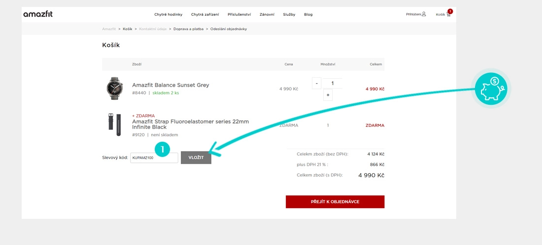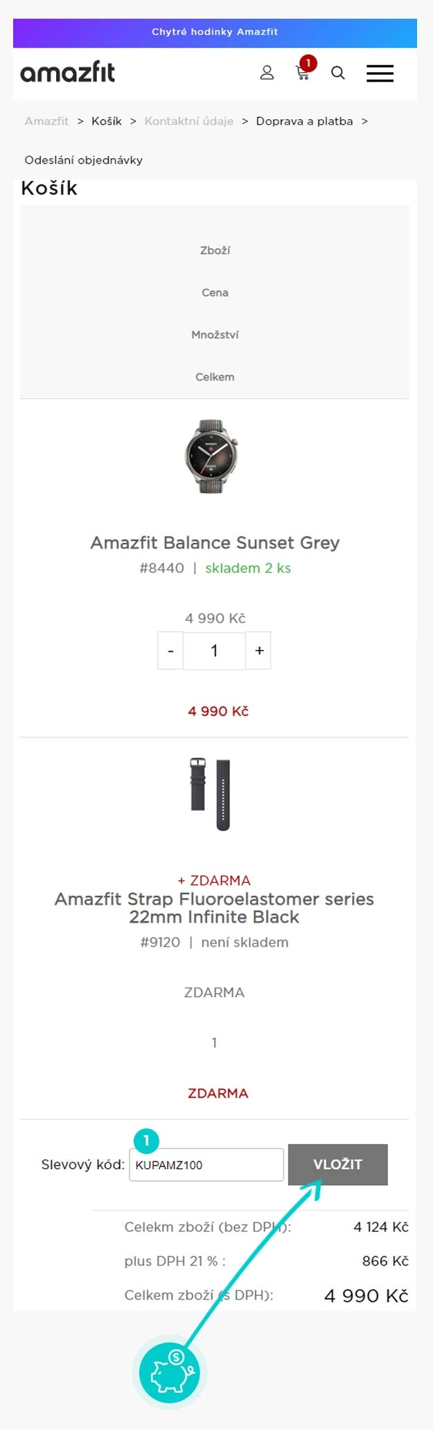 Vyberte si produkt v eshopu amazfit.cz, o který máte zájem, stiskněte tlačítko "Do košíku" a produkt se automaticky vloží do nákupního košíku. Přímo v nákupním košíku pod vybranými produkty klikněte na políčko vedle "Slevový kód". Zde vložte zkopírovaný slevový kód nebo jej ručně vepište a potvrďte tlačítkem "Vložit".