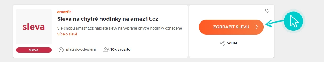 Vyberte si na naší stránce konkrétní Amazfit slevu a klikněte na tlačítko "Zobrazit slevu". Automaticky budete přesměrováni přímo na akční nabídku v internetovém obchodě amazfit.cz, kde můžete produkt nakoupit se slevou.