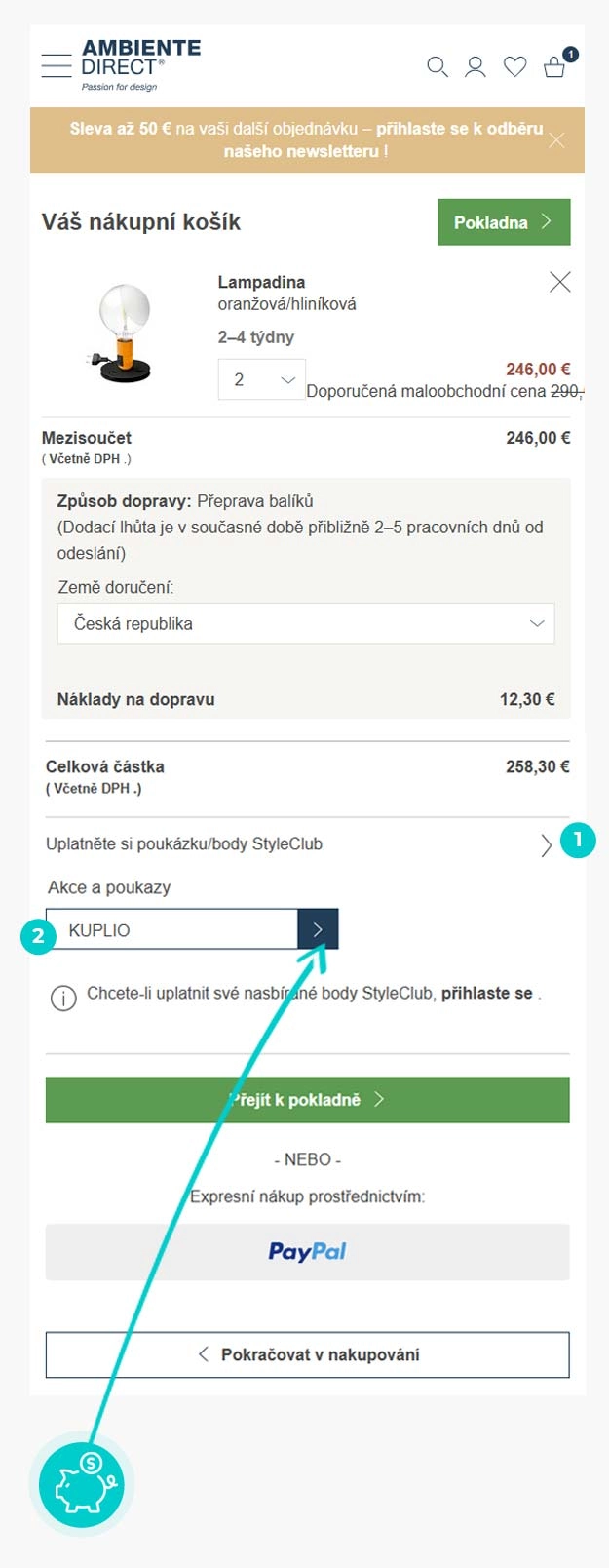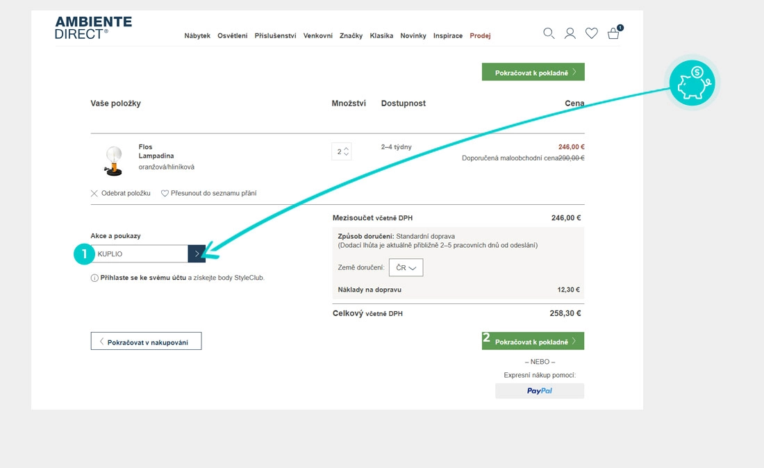 Vyberte si produkt v eshopu Ambientedirect.com, o který máte zájem, stiskněte tlačítko "Přidat do košíku" a produkt se automaticky vloží do nákupního košíku. Přímo v nákupním košíku pod vybranými produkty klikněte na políčko "Váš kód". Zde vložte zkopírovaný slevový kód nebo jej ručně vepište a potvrďte šipkou.