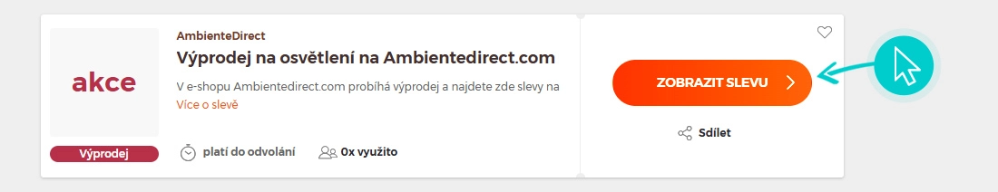 Vyberte si na naší stránce konkrétní AmbienteDirect slevu a klikněte na tlačítko "Zobrazit slevu". Automaticky budete přesměrováni přímo na akční nabídku v internetovém obchodě Ambientedirect.com, kde můžete produkt nakoupit se slevou.