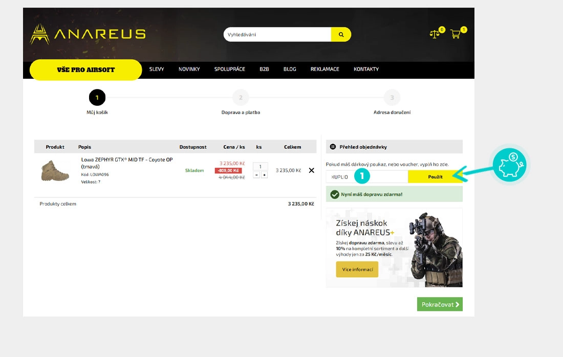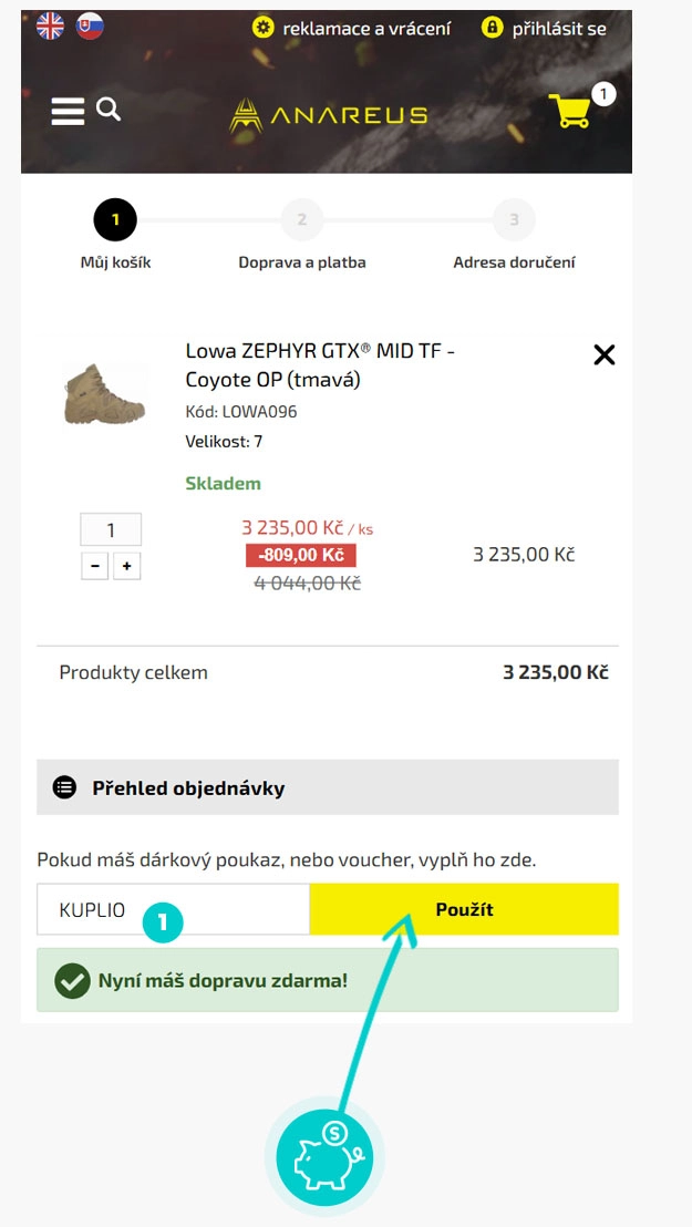 Zkopírujte nebo si opište slevový kód a klikněte na tlačítko "Přejít do obchodu". Následně budete přesměrováni přímo do e-shopu Anareus.cz.