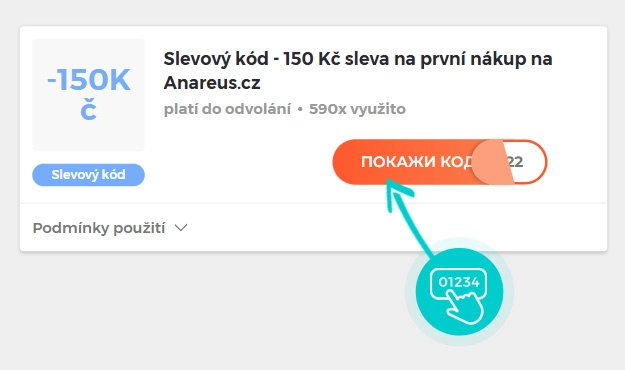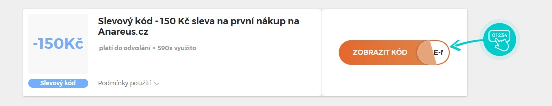 Vyberte si konkrétní slevový kód na naší stránce, který si chcete uplatnit v e-shopu Anareus.cz. Klikněte na oranžové tlačítko "Zobrazit kód".