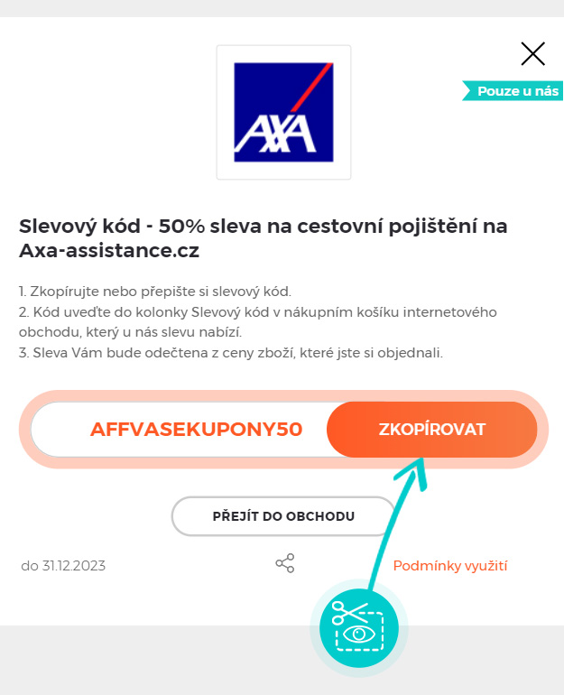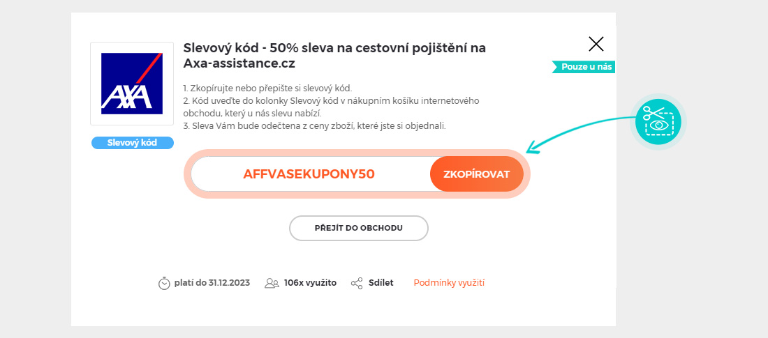 Zkopírujte nebo si opište slevový kód a klikněte na tlačítko "Přejít do obchodu". Následně budete přesměrováni přímo do eshopu Axa-assistance.cz.
