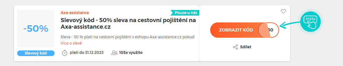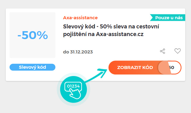 Vyberte si konkrétní slevový kód na naší stránce, který si chcete uplatnit v eshopu Axa-assistance.cz. Klikněte na oranžové tlačítko "Zobrazit kód".