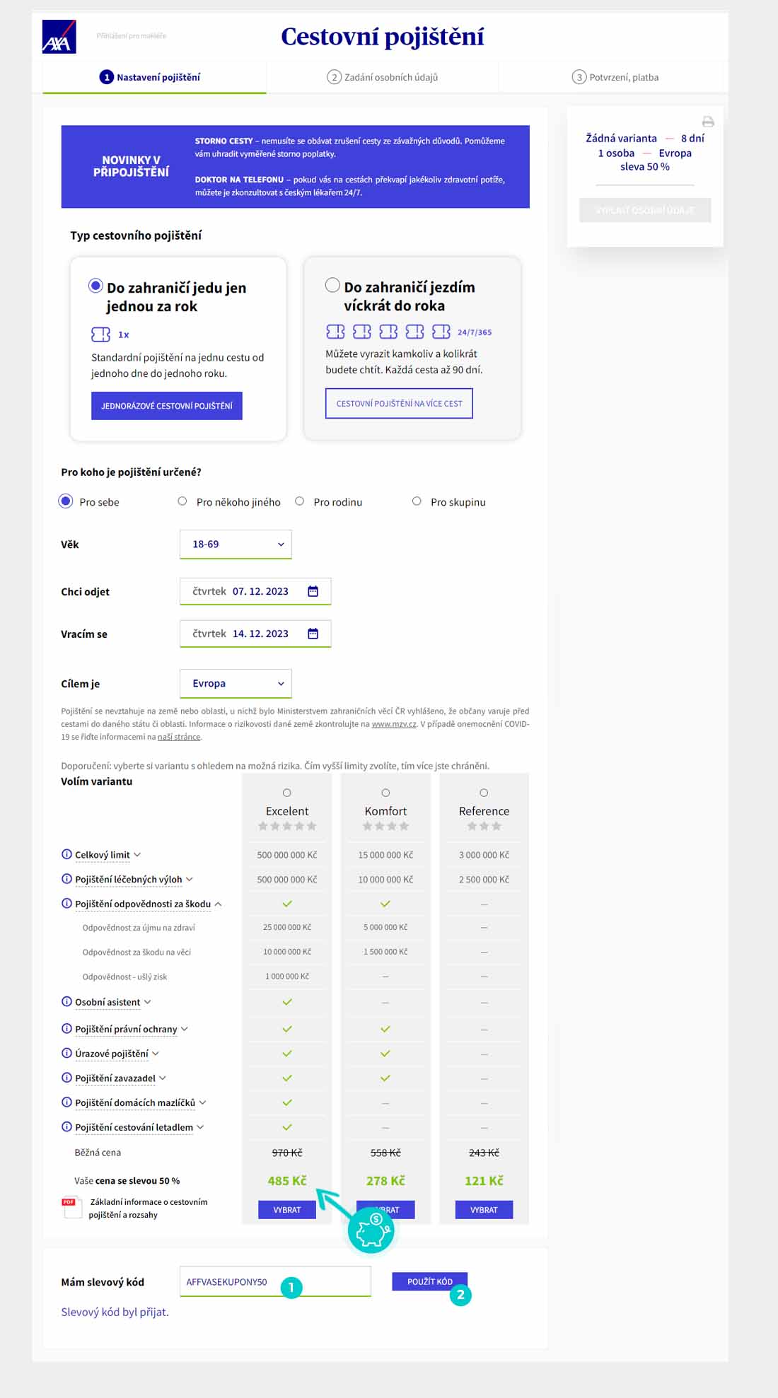 Sleva - 50 % platí na cestovní pojištění v eshopu Axa-assistance.cz pokud zadáte slevový kód v nákupním košíku. Nejlepší slevové kupóny najdete na Vasekupony.cz. Využijte slevový kupón AXA-assistance a cestovní pojištění nakoupíte levněji.