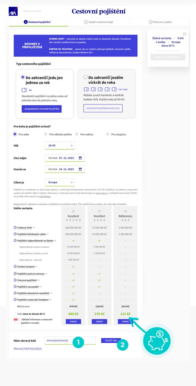 Využitím slevových kódů můžete získat Axa cestovní pojištění s výhodami až do 70% slevy, včetně pojištění léčebných výloh, odpovědnosti či zrušení letu. Ochráníte sebe i svůj majetek v případě havárie, nekvalitní opravy či právní pomoci při cestování. Pojištění si snadno vyřídíte online, včetně zdravotního pojištění pro cizince či rodinného právníka. Axa nabízí profesionální služby za bezkonkurenční ceny se spoustou dalších výhod.