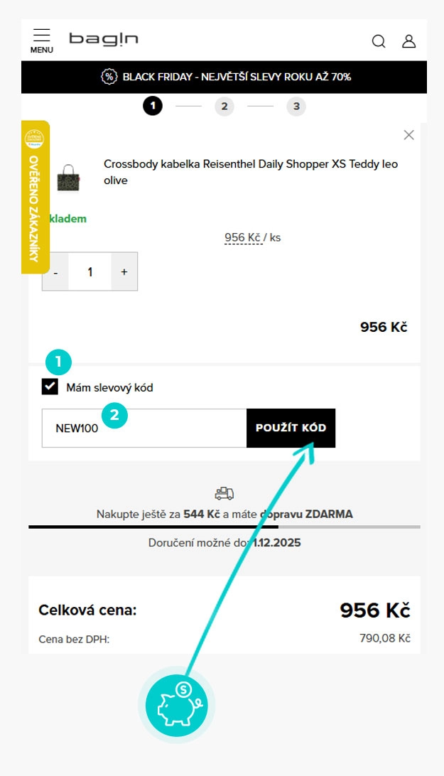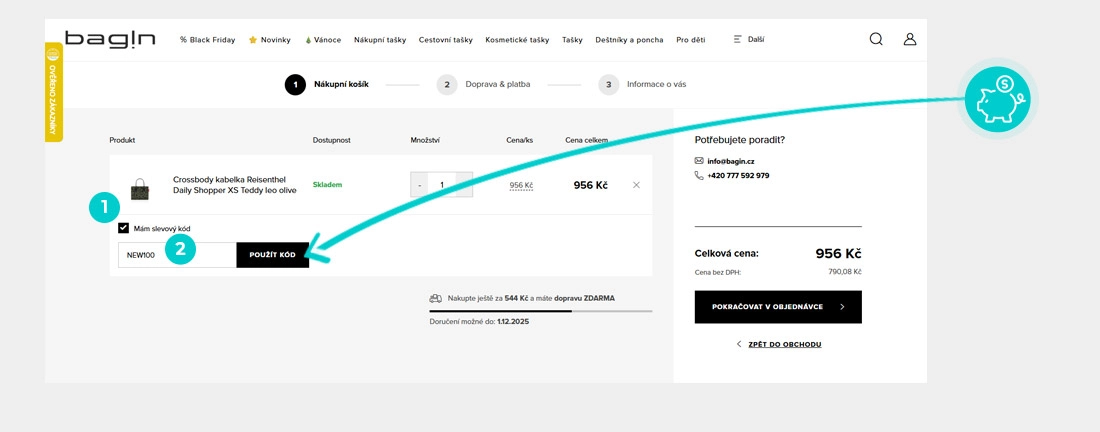 Vyberte si produkt v e-shopu Bagin.cz, o který máte zájem, stiskněte tlačítko "Přidat do košíku" a produkt se automaticky vloží do nákupního košíku. Přímo v nákupním košíku najdete pod vámi vybraným produktem políčko "Máte slevový poukaz?". Zde vložte zkopírovaný slevový kód nebo jej ručně vepište a potvrďte tlačítkem "Použít kód.