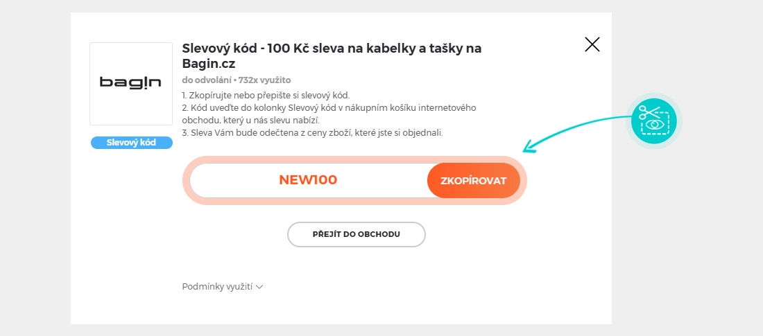 Zkopírujte nebo si opište slevový kód a klikněte na tlačítko "Přejít do obchodu". Následně budete přesměrováni přímo do e-shopu Bagin.cz.