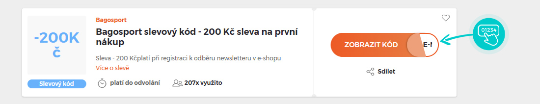 Vyberte si konkrétní slevový kód na naší stránce, který si chcete uplatnit v e-shopu Bagosport.cz. Klikněte na oranžové tlačítko "Zobrazit kód".