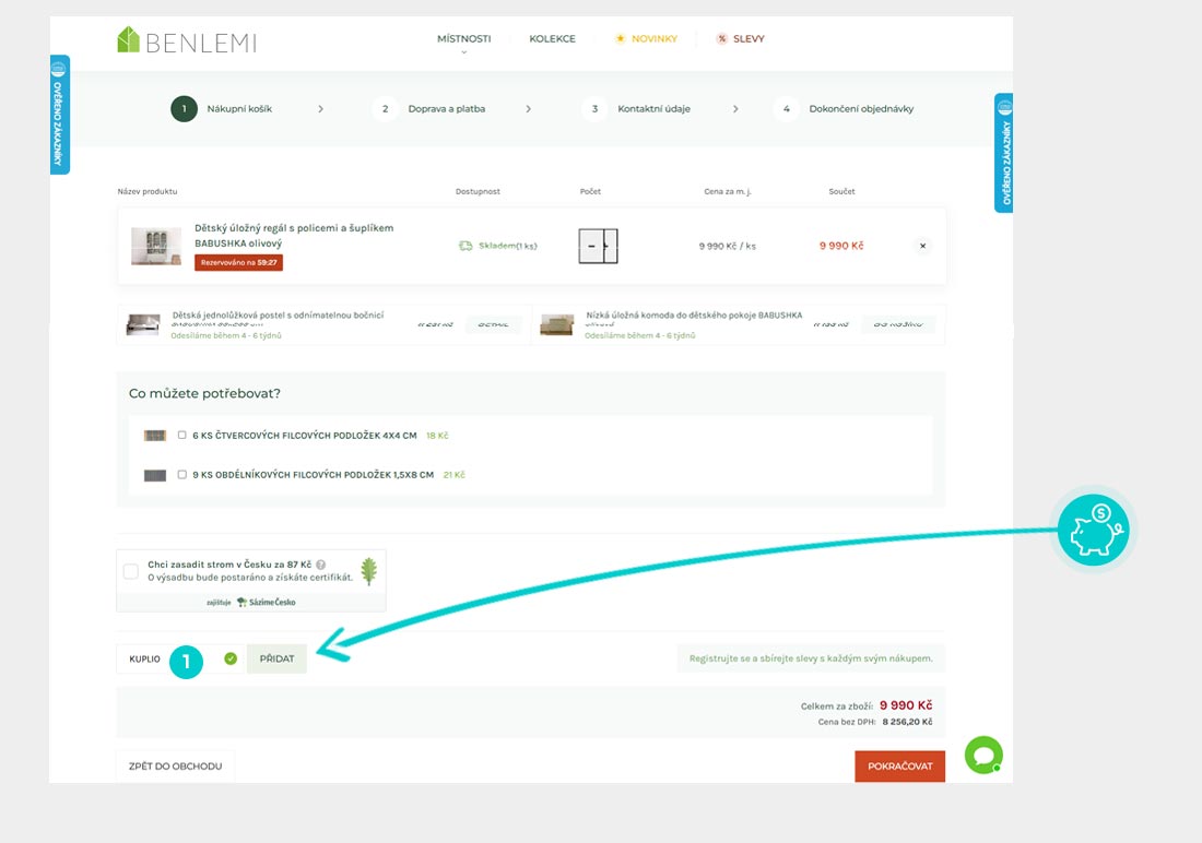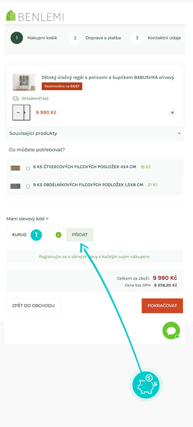 Vyberte si produkt v e-shopu Benlemi.cz, o který máte zájem, stiskněte tlačítko "Přidat do košíku" a produkt se automaticky vloží do nákupního košíku. Přímo v nákupním košíku najdete pod vámi vybraným produktem políčko "Vložit slevový kupón". Zde vložte zkopírovaný slevový kód nebo jej ručně vepište a potvrďte tlačítkem "Přidat".