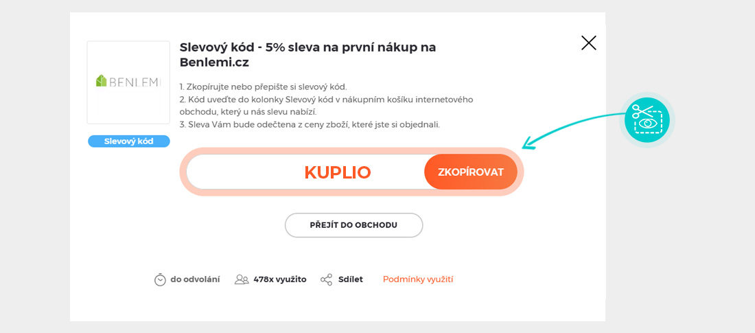 Zkopírujte nebo si opište slevový kód a klikněte na tlačítko "Přejít do obchodu". Následně budete přesměrováni přímo do e-shopu Benlemi.cz.