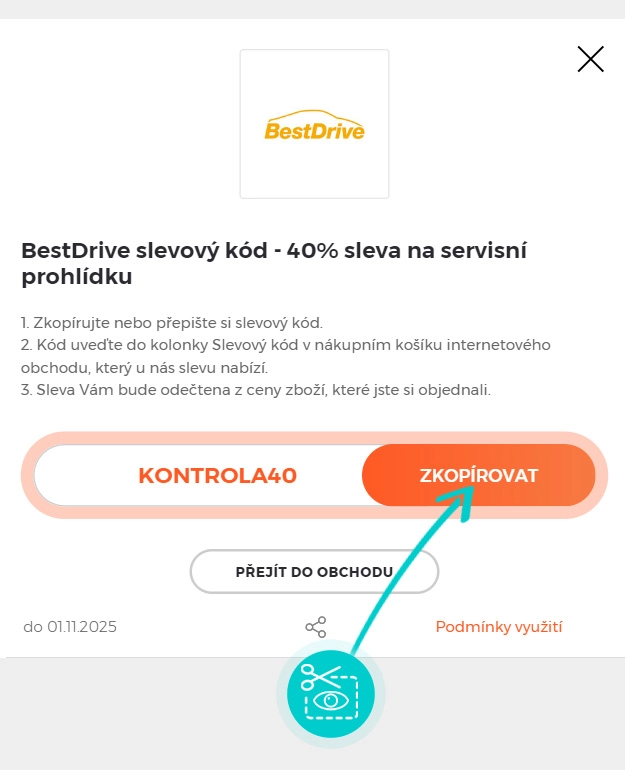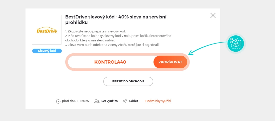 Zkopírujte nebo si opište slevový kód a klikněte na tlačítko "Přejít do obchodu". Následně budete přesměrováni přímo do e-shopu BestDrive.cz.