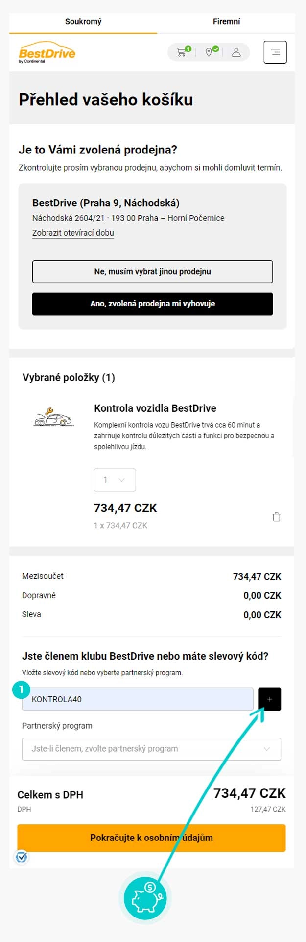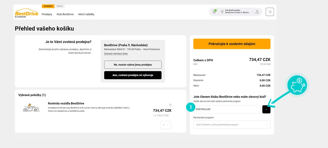 Vyberte si produkt v e-shopu BestDrive.cz, o který máte zájem, stiskněte tlačítko "Přidat do košíku" a produkt se automaticky vloží do nákupního košíku. Přímo v nákupním košíku najdete pod vámi vybraným produktem políčko "Jste členem klubu BestDrive nebo máte slevový kód". Zde vložte zkopírovaný slevový kód nebo jej ručně vepište a potvrďte tlačítkem šípky.