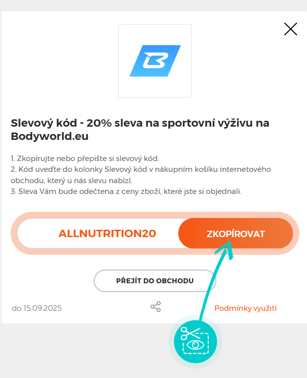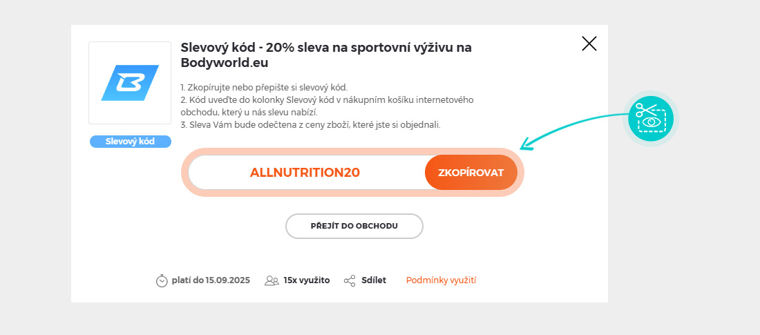 Zkopírujte nebo si opište slevový kód a klikněte na tlačítko "Přejít do obchodu". Následně budete přesměrováni přímo do e-shopu Bodyworld.eu/cz.