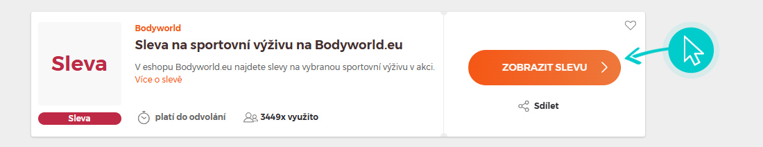 Vyberte si na naší stránce konkrétní Bodyworld slevu a klikněte na tlačítko "Získej slevu". Automaticky budete přesměrováni přímo na akční nabídku v internetovém obchodě Bodyworld.eu/cz, kde můžete produkt nakoupit se slevou.