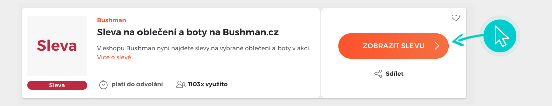 Vyberte si na naší stránce konkrétní Bushman slevu a klikněte na tlačítko „Viz slevu“. Automaticky budete přesměrováni přímo na akční nabídku v internetovém obchodě Bushman.cz, kde můžete produkt nakoupit se slevou.