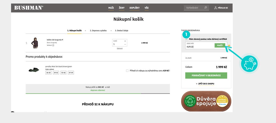 Vyberte si produkt v eshopu Bushman.cz, o který máte zájem, stiskněte tlačítko „Přidat do košíku“ a produkt se automaticky vloží do nákupního košíku. Přímo v nákupním košíku naleznete pod Vámi vybraným produktem políčko „Mám slevový poukaz nebo dárkový certifikát“. Zde vložte zkopírovaný slevový kód nebo jej ručně vepište a potvrďte tlačítkem „Použít“.