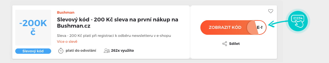 Vyberte si konkrétní slevový kód na naší stránce, který si chcete uplatnit v eshopu Bushman.cz. Klepněte na oranžové tlačítko „Zobrazit kód“.