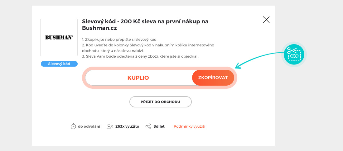 Zkopírujte nebo si odepište slevový kód a klikněte na tlačítko „Přejít do obchodu“. Následně budete přesměrováni přímo do eshopu Bushman.cz.
