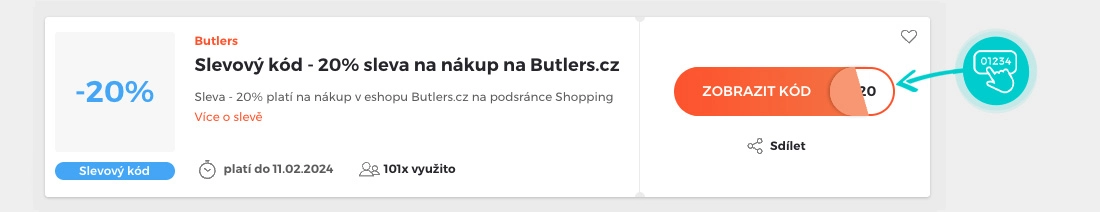 Vyberte si konkrétní slevový kód na naší stránce, který si chcete uplatnit v e-shopu Butlers.cz. Klikněte na oranžové tlačítko "Zobrazit kód".