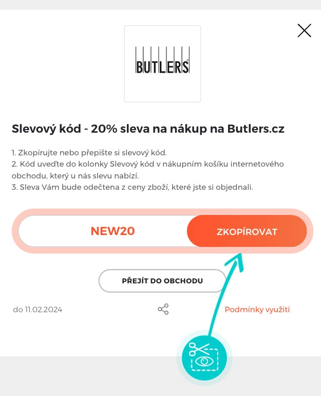Zkopírujte nebo si opište slevový kód a klikněte na tlačítko "Přejít do obchodu". Následně budete přesměrováni přímo do e-shopu Butlers.cz.