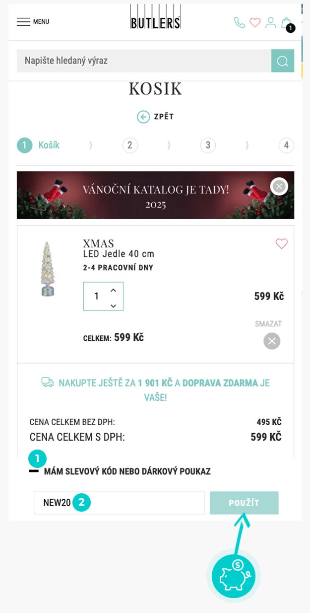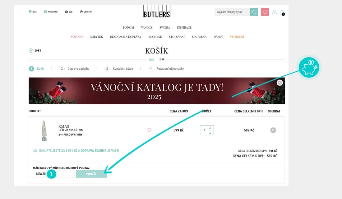 Vyberte si produkt v e-shopu Butlers.cz, o který máte zájem, stiskněte tlačítko "Vložit do košíku" a produkt se automaticky vloží do nákupního košíku. Přímo v nákupním košíku pod vybranými produkty v sekci Dokončit objednávku klikněte na políčko "Mám slevový kód“. Zde vložte zkopírovaný slevový kód nebo jej ručně vepište a potvrďte tlačítkem "Použít“.
