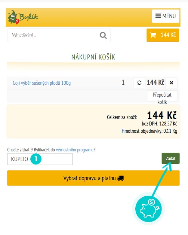 Vyberte si produkt v e-shopu Bylik.cz, o který máte zájem, stiskněte tlačítko "Přidat do košíku" a produkt se automaticky vloží do nákupního košíku. Přímo v nákupním košíku najdete pod vámi vybraným produktem políčko "Zadejte slevový kód". Zde vložte zkopírovaný slevový kód nebo jej ručně vepište a potvrďte tlačítkem "Zadat".