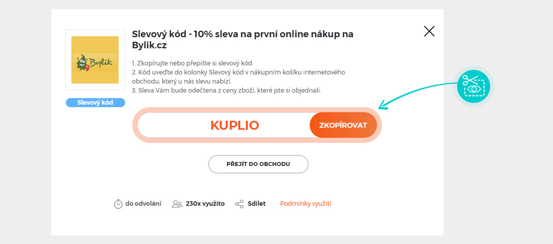 Zkopírujte nebo si opište slevový kód a klikněte na tlačítko "Přejít do obchodu". Následně budete přesměrováni přímo do e-shopu Bylik.cz.
