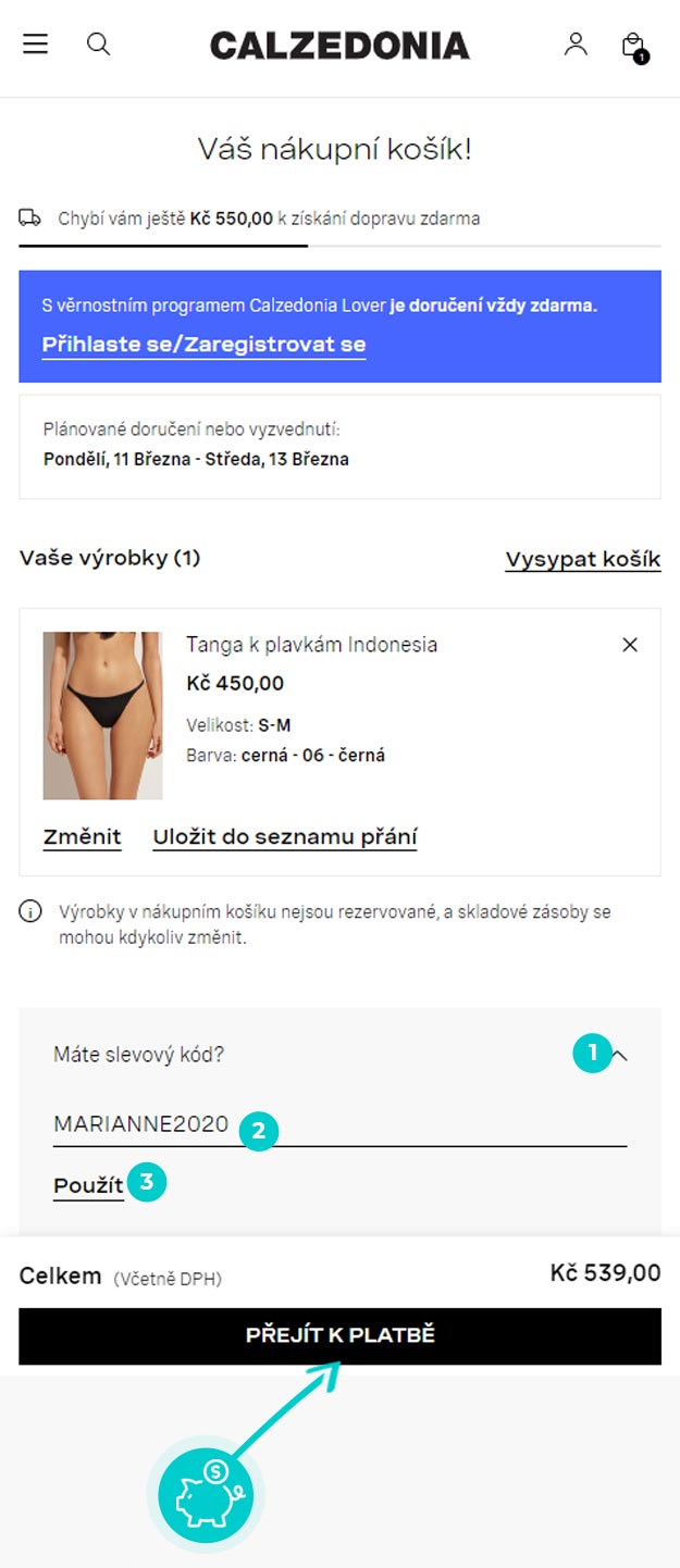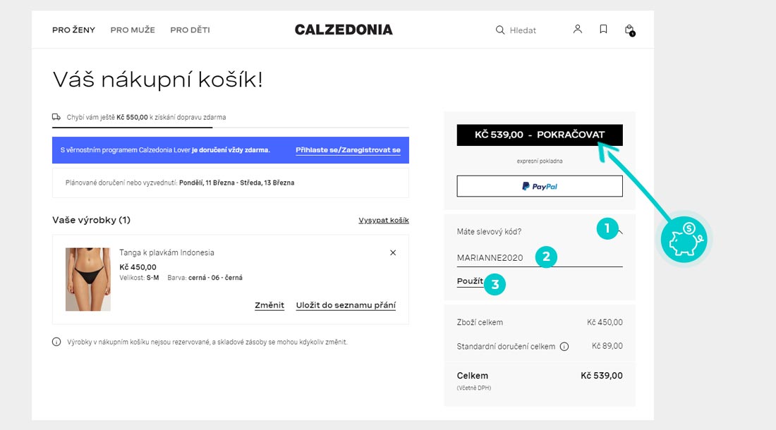 Vyberte si produkt v e-shopu Calzedonia.cz, o který máte zájem, stiskněte tlačítko "Přidat do nákupního košíku" a produkt se automaticky vloží do nákupního košíku. Přímo v nákupním košíku najdete vpravo políčko "Máte slevový kód?". Zde vložte zkopírovaný slevový kód nebo jej ručně vepište a potvrďte tlačítkem "Použít".