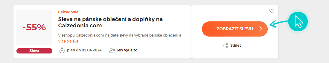 Vyberte si na naší stránce konkrétní Calzedonia slevu a klikněte na tlačítko "Získej slevu". Automaticky budete přesměrováni přímo na akční nabídku v internetovém obchodě Calzedonia.cz, kde můžete produkt nakoupit se slevou.