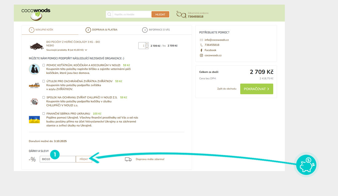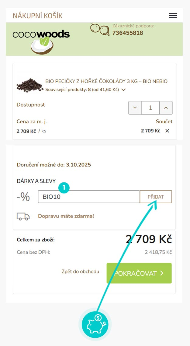Vyberte si produkt v e-shopu Cocowoods.cz, o který máte zájem, stiskněte tlačítko "Přidat do košíku" a produkt se automaticky vloží do nákupního košíku. Přímo v nákupním košíku najdete pod vámi vybraným produktem políčko "Vložit slevový kupón". Zde vložte zkopírovaný slevový kód nebo jej ručně vepište a potvrďte tlačítkem "Přidat".