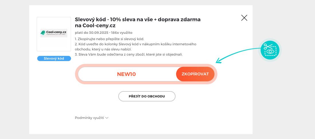 Zkopírujte nebo si opište slevový kód a klikněte na tlačítko "Přejít do obchodu". Následně budete přesměrováni přímo do eshopu Cool-ceny.cz.