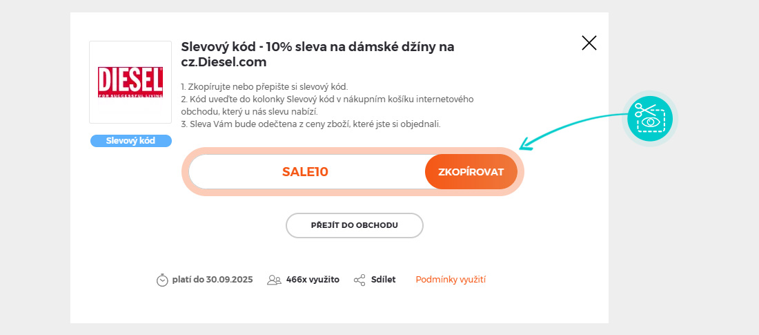 Zkopírujte nebo si opište slevový kód a klikněte na tlačítko "Přejít do obchodu". Následně budete přesměrováni přímo do eshopu Diesel.com.
