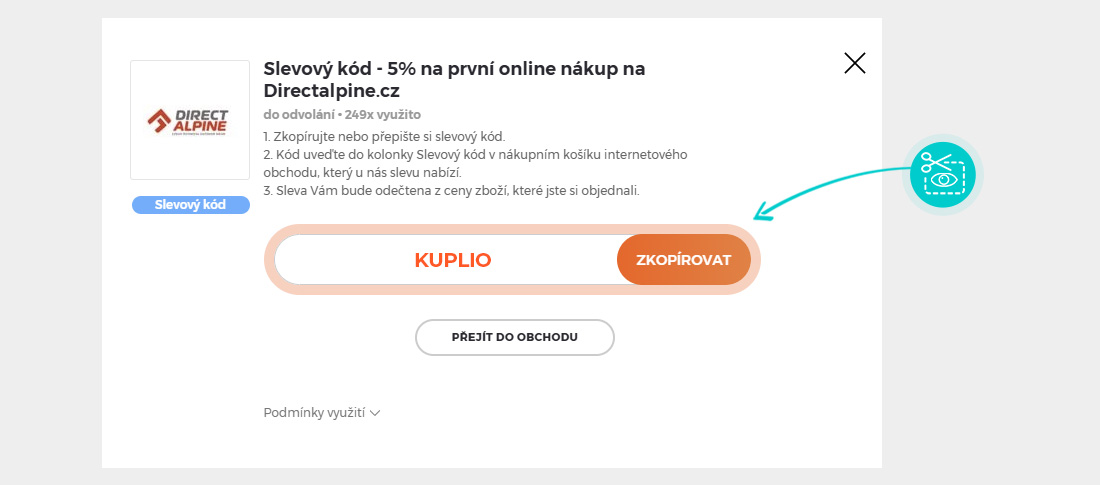 Zkopírujte nebo si opište slevový kód a klikněte na tlačítko "Přejít do obchodu". Následně budete přesměrováni přímo do e-shopu Directalpine.cz.