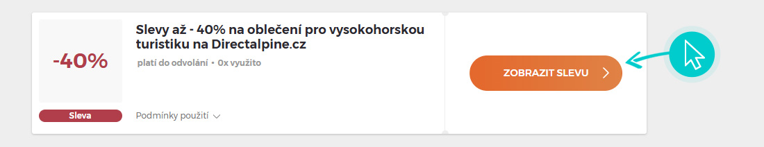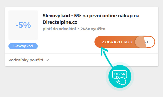 Vyberte si konkrétní slevový kód na naší stránce, který si chcete uplatnit v e-shopu Directalpine.cz. Klikněte na oranžové tlačítko "Zobrazit kód".