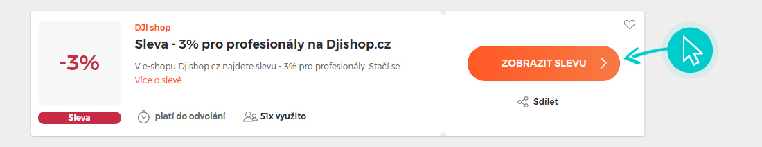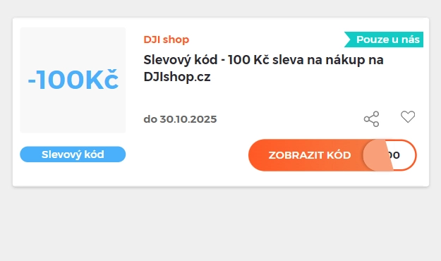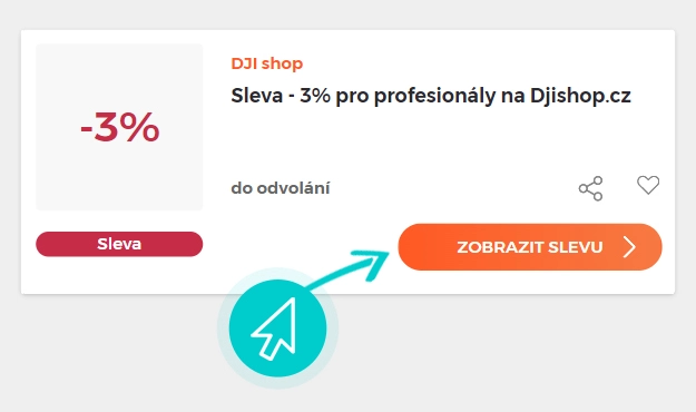 Vyberte si na naší stránce konkrétní DJI shop slevu a klikněte na tlačítko "Zobrazit slevu". Automaticky budete přesměrováni přímo na akční nabídku v internetovém obchodě DJIshop.cz, kde můžete produkt nakoupit se slevou.