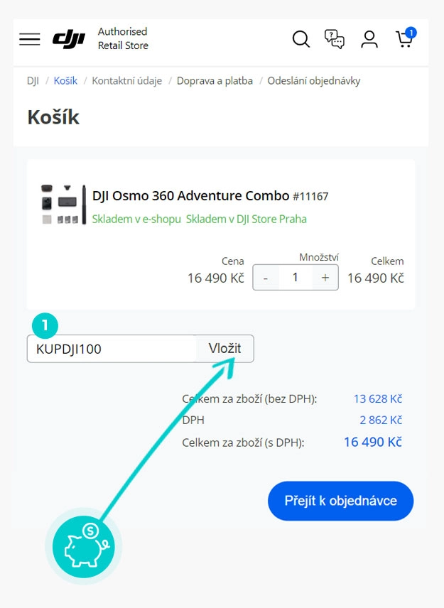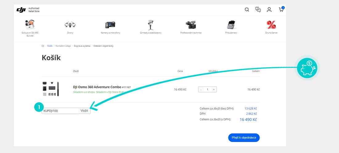 Vyberte si produkt v eshopu DJIshop.cz, o který máte zájem, stiskněte tlačítko "Do košíku" a produkt se automaticky vloží do nákupního košíku. Přímo v nákupním košíku pod vybranými produkty klikněte na políčko "Slevový k=od". Zde vložte zkopírovaný slevový kód nebo jej ručně vepište a potvrďte tlačítkem "Vložit".