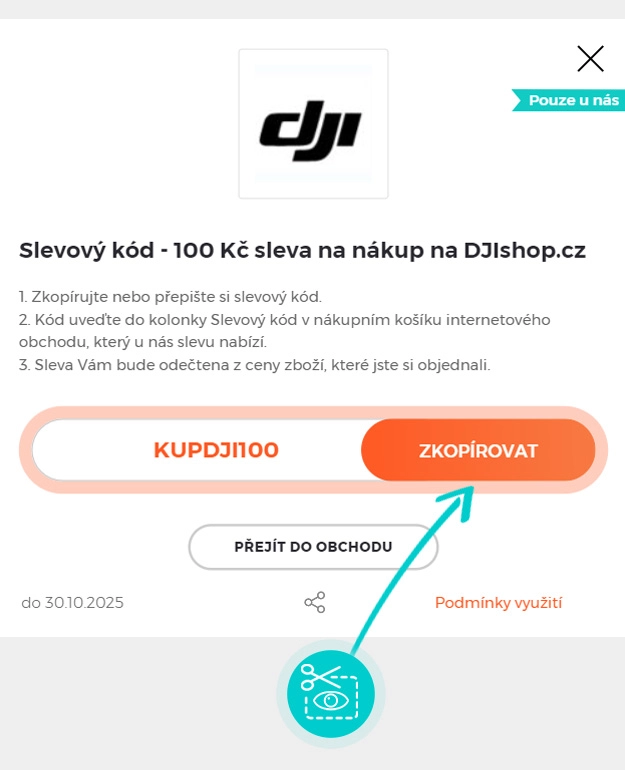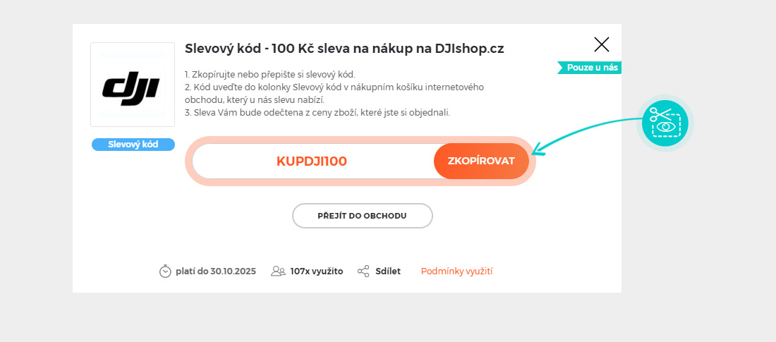 Zkopírujte nebo si opište slevový kód a klikněte na tlačítko "Přejít do obchodu". Následně budete přesměrováni přímo do eshopu DJIshop.cz.